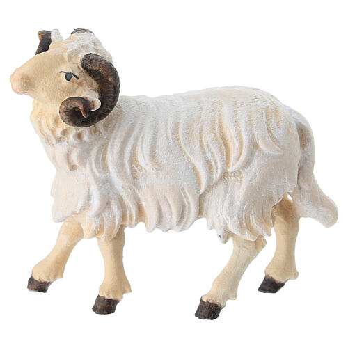 Figurka barana z głową zwróconą w lewo, malowana na drewnie, idealna do szopki o wyskości 9,5 cm.