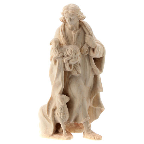 Młody pasterz stojący, z owieczką w jednej ręce i barankiem u stóp. Rzeźba jest starannie wykonana z drewna z Val Gardena o naturalnym wykończeniu.