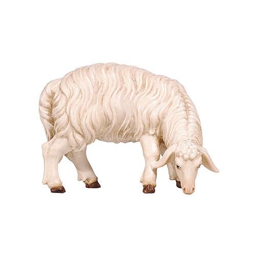 Owca jedząca, głowa skierowana w prawo, 12 cm szopka Mahlknecht, drewno malowane Val Gardena.