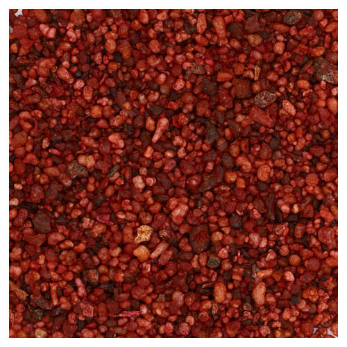 Granulki są nieregularne, lekko błyszczące i utrzymane w czerwonej tonacji; powierzchnia została potraktowana olejkami zapachowymi i pigmentami.