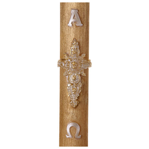 Świeca paschalna z wosku parafinowego i z satynowym wykończeniem. Jest wysoka 120 cm i ma 8 cm średnicy.