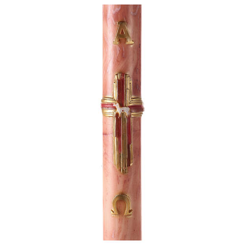 Paschał charakteryzuje różowe tło z efektem marmurkowatym i dekoracje przedstawiające stylizowany krzyż z wizerunkiem baranka pośrodku.