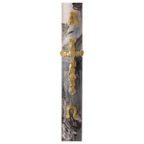Ta świeca wielkanocna została następnie ręcznie pomalowana. Charakteryzuje się białym tłem z efektem marmurkowatym oraz udekorowana wizerunkami w reliefie przedstawiającymi złoty krzyż i litery Alfa i Omega.