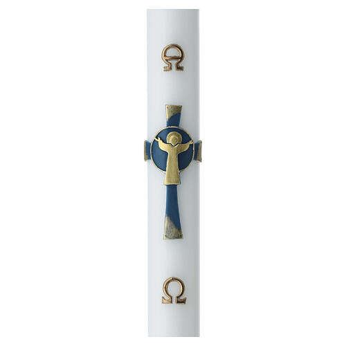 Paschał biały 120 x 8 cm, z postacią Zmartwychwstałego na niebieskim krzyżu