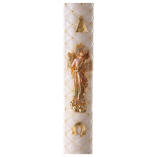 Ta świeca wielkanocna charakteryzuje się tłem z efektem pikowanym oraz udekorowana wizerunkami w reliefie przedstawiającymi Jezusa Zmartwychwstałego ponad krzyżem.