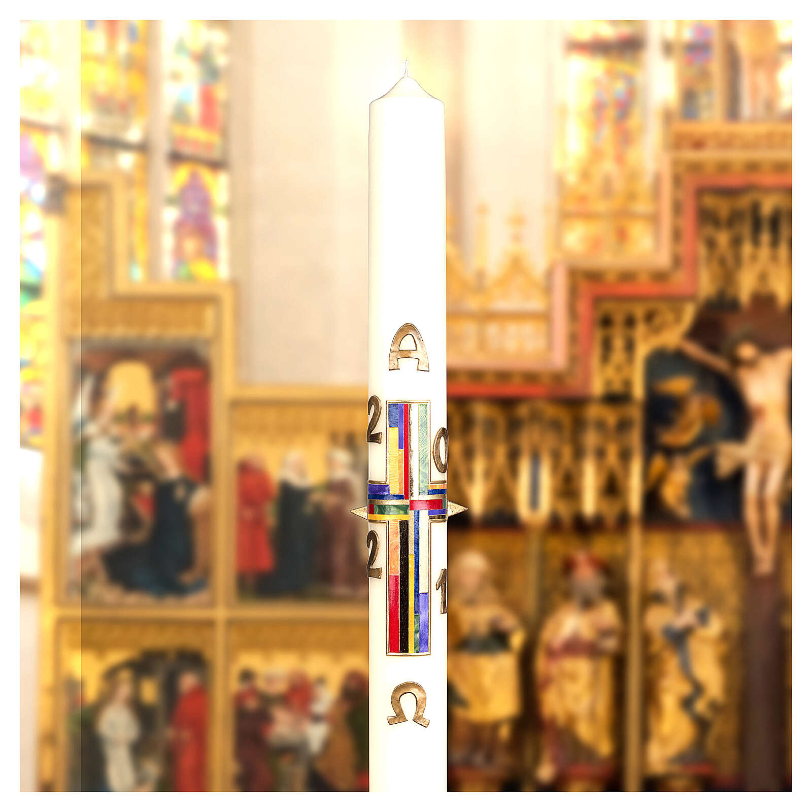 Paschał krzyż kolorowe prostokąty 80 x 8 cm wosk pszczeli. Wielkanocna świeca o wysokości 80 cm i średnicy 8 cm, ręcznie dekorowana przez artystów niemieckiego przedsiębiorstwa o długiej tradycji. Paschał jest wykonany w 90% z parafiny i w 10% z wosku. W centralnej części świecy znajduje się nowoczesna dekoracja na którą składa się krzyż złożony z wielu kolorowych prostokątów. Nad i pod dekoracja znajduja się symbole Alfa i Omega a także cyfry roku bieżącego.