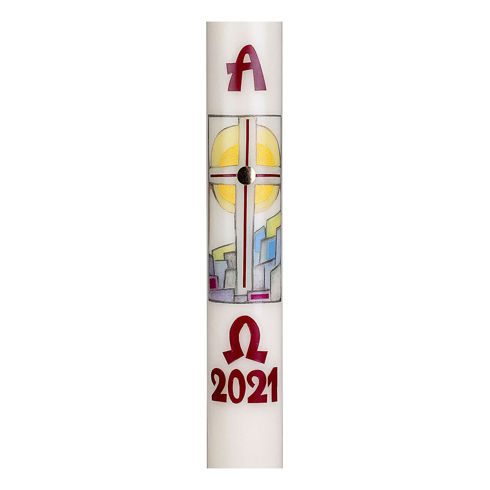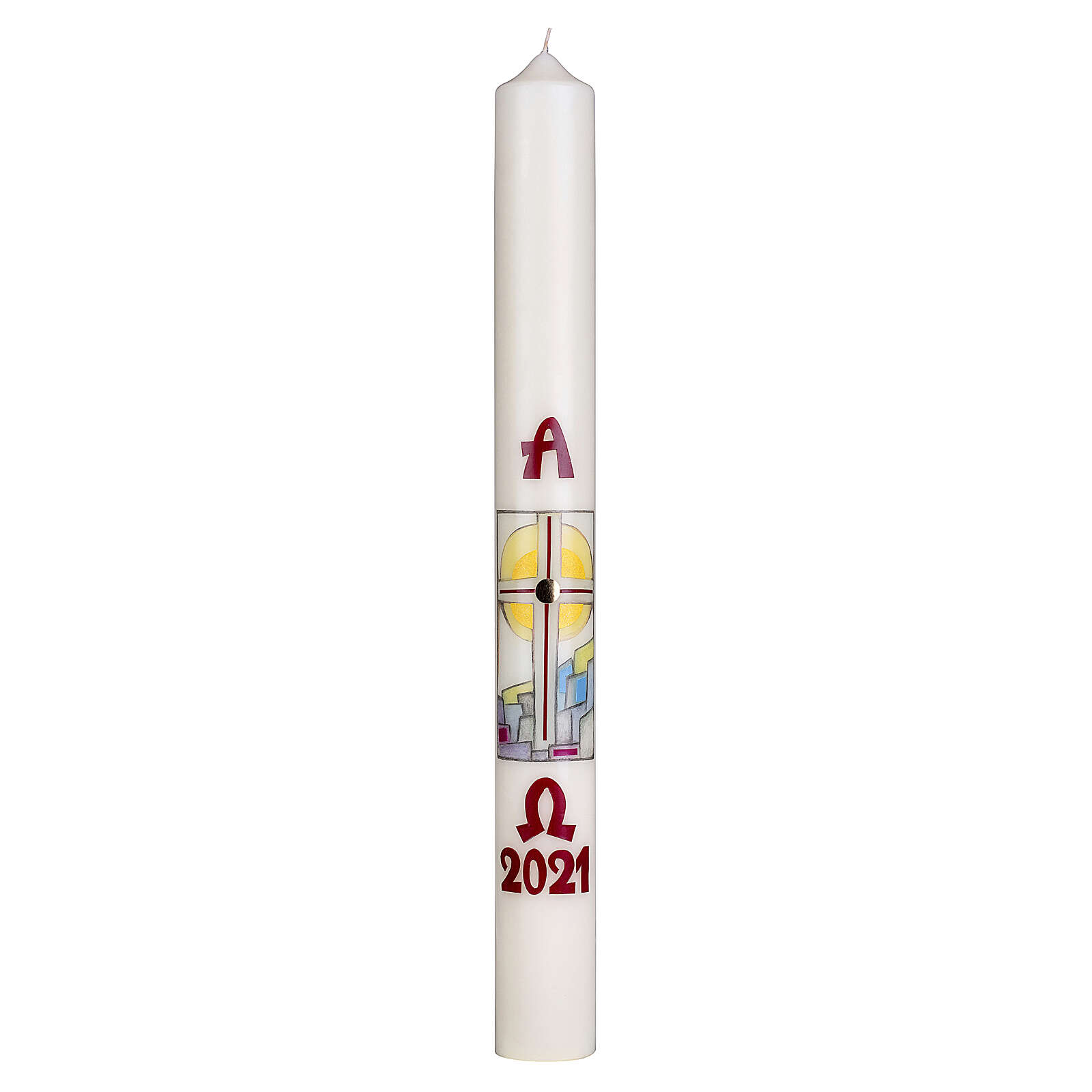 Paschał krzyż krajobraz stylizowany 80 x 8 cm. Świeca Wielkanocna wykonana w 90% z parafiny i w 10% z wosku pszczelego. Ręcznie dekorowana. W centralnej części znajduje się krzyż na tle słońca i stylizowanego krajobrazu. Nad i pod dekoracją znajdują się symbole Alfa i Omega i cyfry bierzącego roku. Paschał został wykonany przez niemieckie przedsiębiorstwo o wieloletniej tradycji i posiada wymiary: wysokość 80 cm, średnica 8 cm.