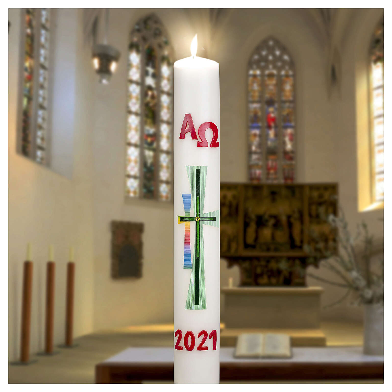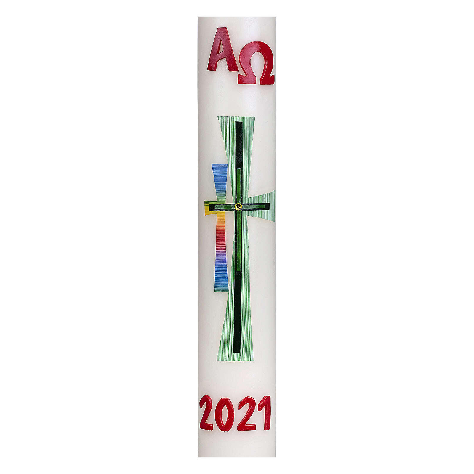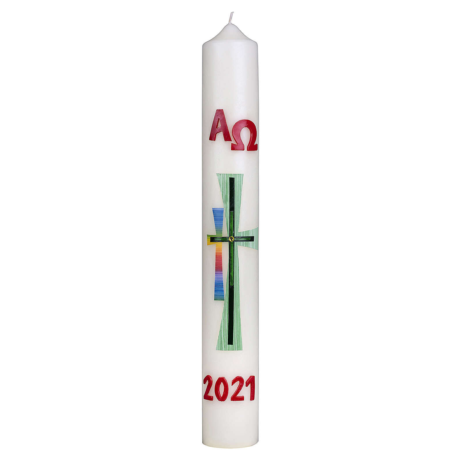 Paschał krzyż zielony tęczowy 80 x 8 cm. Wielkanocna świeca w nowoczesnym stylu, udekorowana dwoma krzyżami na przedniej części - jeden zielony z kryształkiem w centrum, natomiast drugi w kolorach tęczy. Nad i pod dekoracją znajdują się symbole Alfa i Omega i cyfry bierzącego roku. Paschał został wykonany przez niemieckie przedsiębiorstwo o wieloletniej tradycji i posiada wymiary: wysokość 80 cm, średnica 8 cm. Jest wykonany w 90% z parafiny i w 10% z wosku pszczelego.