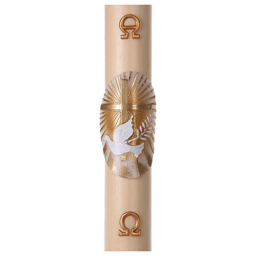 Paschał wosk pszczeli z dekoracją w formie płaskorzeźby: Krzyż i Gołębica oraz symbole Alfa i Omega.