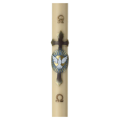 Uroczysta świeca paschalna z wosku pszczelego o wymiarach 120 x 8 cm w naturalnym kolorze ecru, z ręcznie wykończoną powierzchnią. Centralny motyw w płaskorzeźbie przedstawia Gołębicę Ducha Świętego umieszczoną na posrebrzanym krzyżu z niebieskimi promieniami, osadzoną na owalnej podstawie. Symbole Alfa i Omega są wkomponowane bezpośrednio w płaskorzeźbę z wosku.