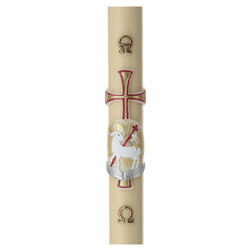 Jest to klasyczna świeca paschalna w kolorze kości słoniowej. Ozdobiona wypukłym przedstawieniem Baranka Bożego na złotym tle, uzupełnionym stylizowanym, czerwonym krzyżem oraz wyrytą parą symboli Alfa i Omega. Ciepłe odcienie i precyzyjne wykonanie w technice niskiego reliefu podkreślają centralny, podwyższony medalion owalny.