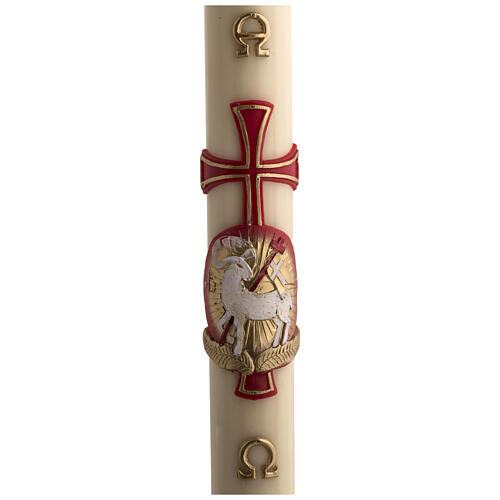 Świeca wielkanocna ze wzmocnieniem z metalu z wosku pszczelego udekorowana Barankiem i krzyżem 8 X 120cm. Udekorowana także symbolami alfa i Omega. Czas palenia się wynosi około 10dni.