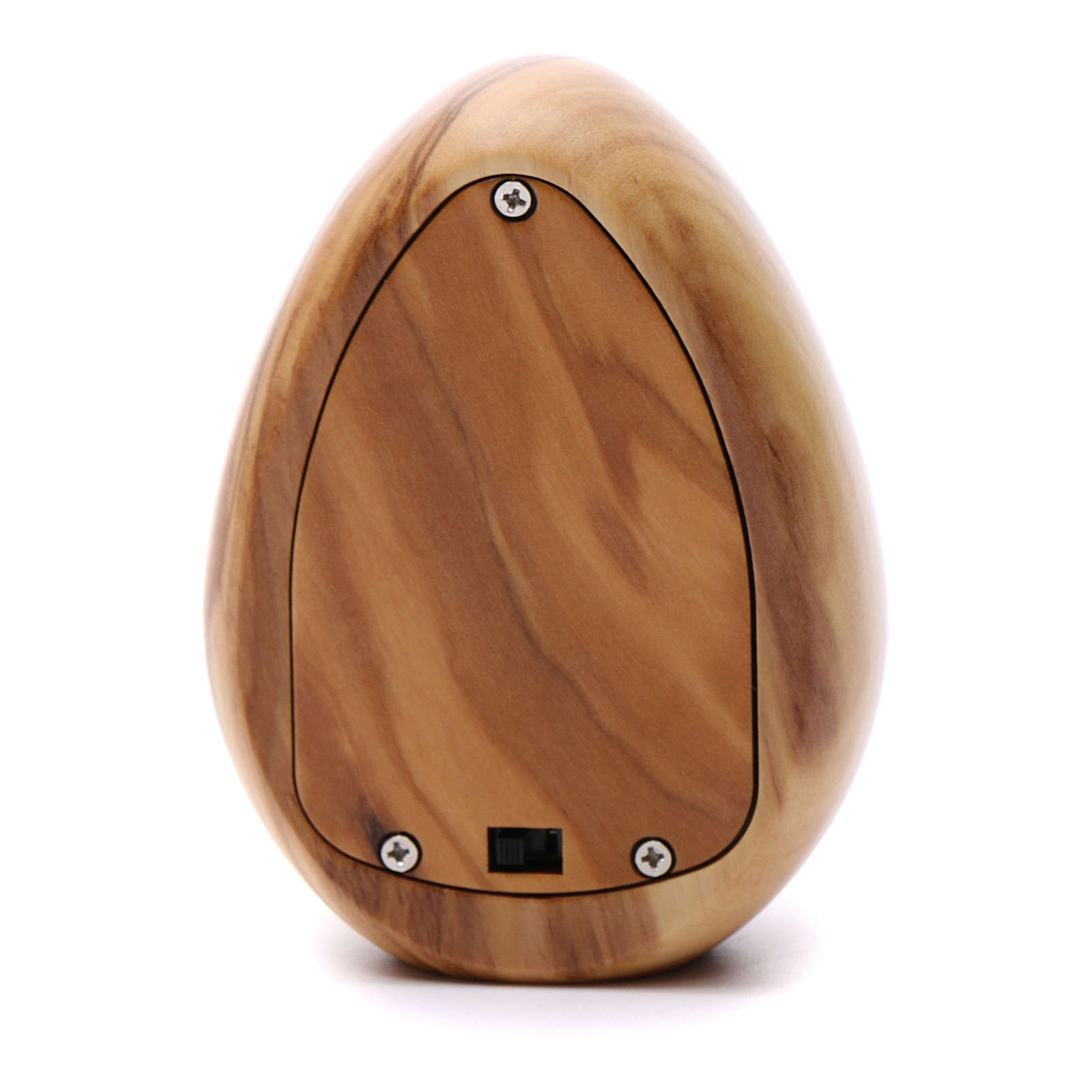 Lampka z drewna oliwnego o jasnym odcieniu i z umieszczoną wewnątrz struktury figurką Dzieciątka Jezus z kolorowej żywicy. Posiada owalny kształt i ozdobny szczegół w postaci gwiazdy komety z pozłacanego srebra.