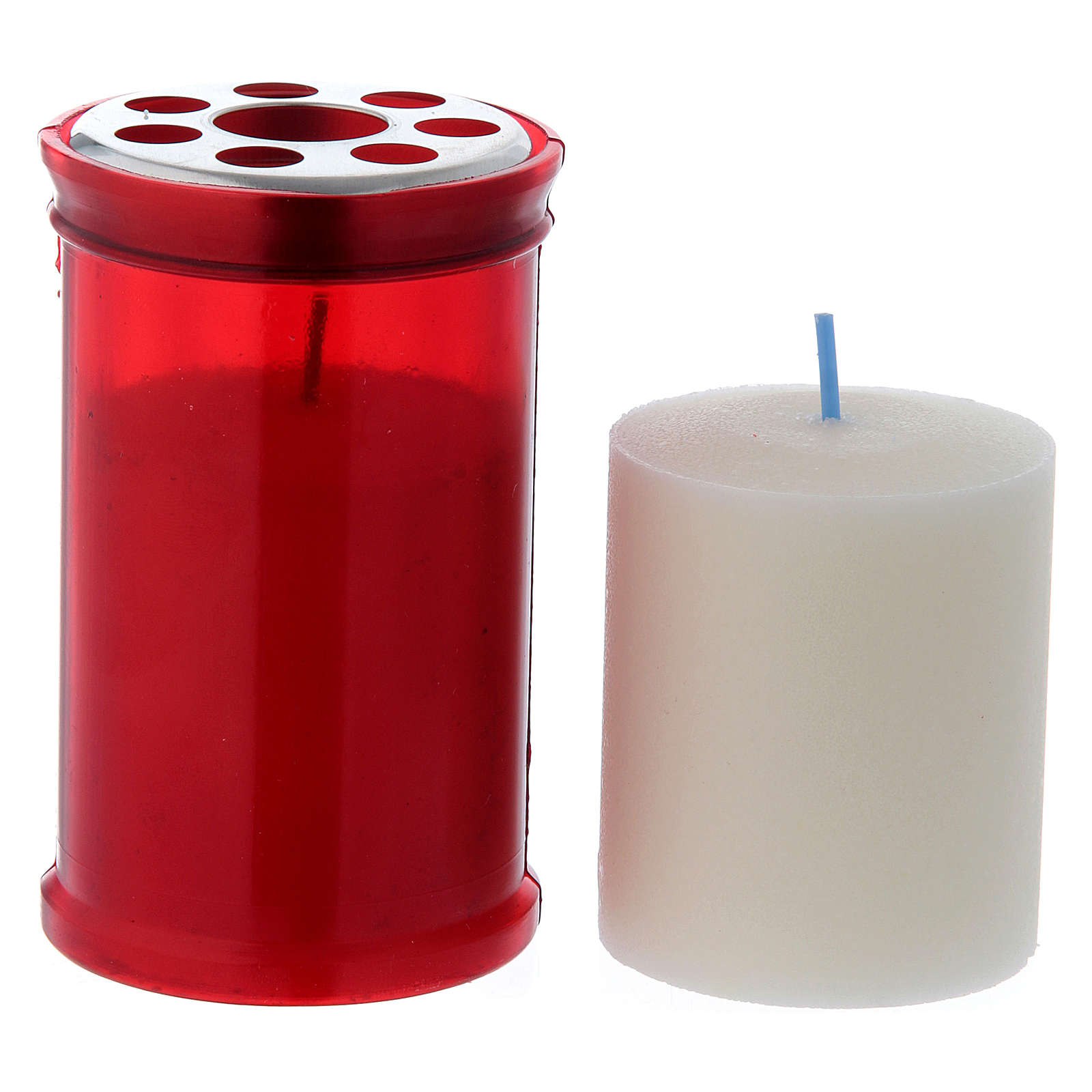 Znicz wotywny 30T w czerwonym kolorze i z białym woskiem, wyposażony w metalową pokrywkę kratkę.