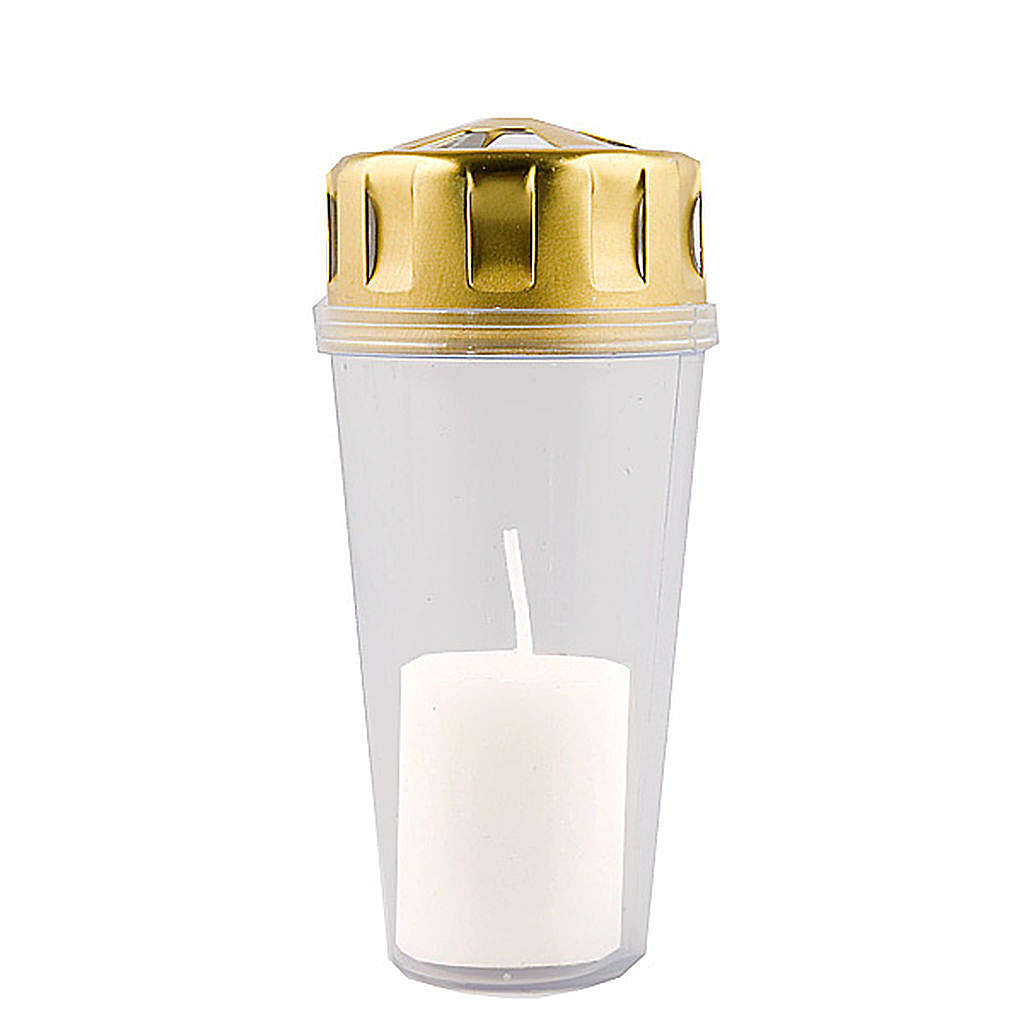 Znicz z pojemnikiem z pvc, z metalową osłoną w złotym kolorze i białą świecą woskową. Płomień jest osłonięty od wiatru i deszczu.