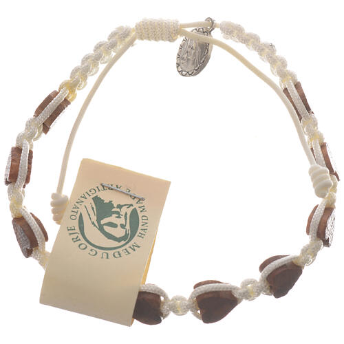 Bransoleta zrealizowana w Medziugorie z koralików w kształcie serca z drewna oliwnego i białego sznurka.
