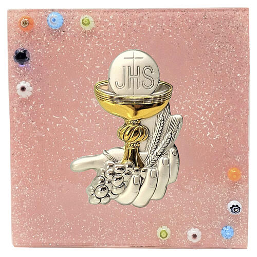 Ikona ze szkła Murano, różowa, z kielichem, na Pierwszą Komunię Świętą