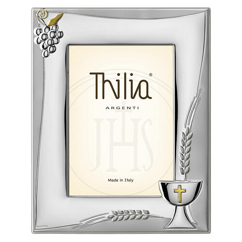 Ramka wykonana z posrebrzanego aluminium, ozdobiona eleganckim reliefem przedstawiającym symbole eucharystyczne: w prawym dolnym rogu znajduje się kielich z grawerowanym krzyżem i kłosami pszenicy, natomiast w lewym górnym rogu umieszczono kiść winogron.