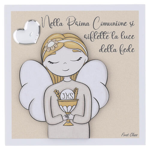 Tabliczka Anioł z kielichem i hostią, Pierwsza Komunia, dziewczynka, 15×15 cm