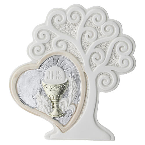 Pamiątka z żywicy przedstawiająca stylizowane Drzewo Życia z centralnym sercem ozdobionym wytłoczonym kielichem i hostią, zaprojektowana z myślą o Pierwszej Komunii.