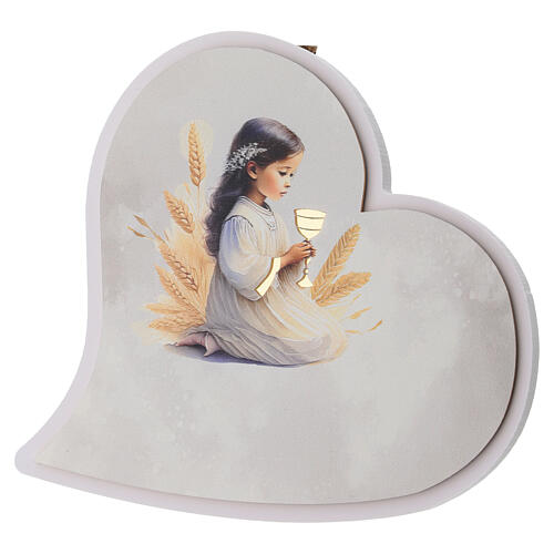 Upominek na Pierwszą Komunię Świętą, dyfuzor do pomieszczeń w kształcie serca z figurką dziewczynki, 14×15×5 cm