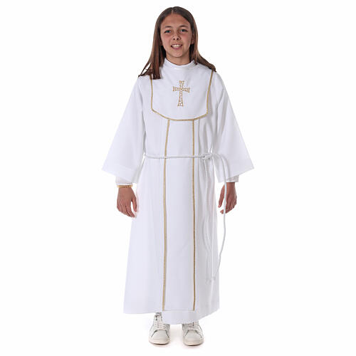 Alba do Pierwszej Komunii dla chłopca lub dziewczynki wyprodukowana w całości we Włoszech z materiałów wyłącznie pochodzenia włoskiego. Ta alba jest biała i posiada stułę, na której został wyhaftowany krzyż z motywem plastra miodu.