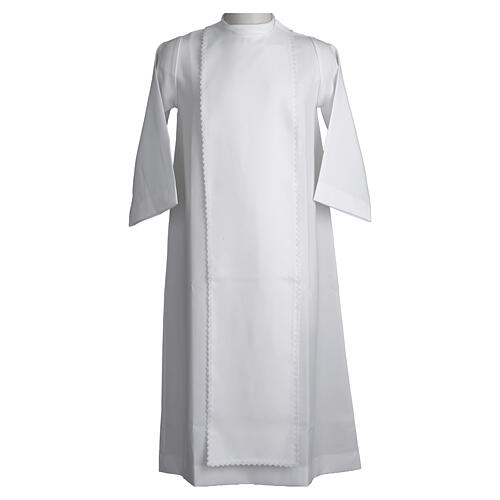 Ta alba do Pierwszej Komunii dla dziewczynki została wyprodukowana w całości we Włoszech z materiałów wyłącznie pochodzenia włoskiego. Ta alba jest biała, posiada szkaplerz z drobą koronką z przodu i została zrealizowana ze 100% poliestru.