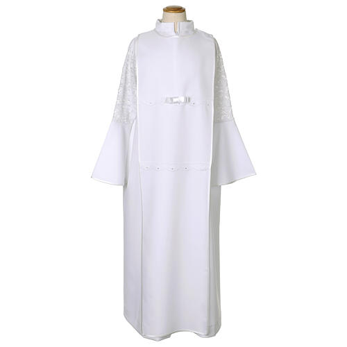 Ozdobny koronkowy pas w talii jest wzbogacony satynową kokardą umocowaną centralnie. Subtelny punkt światła nadaje wyjątkowy blask detali, dodając lekkości tunice.