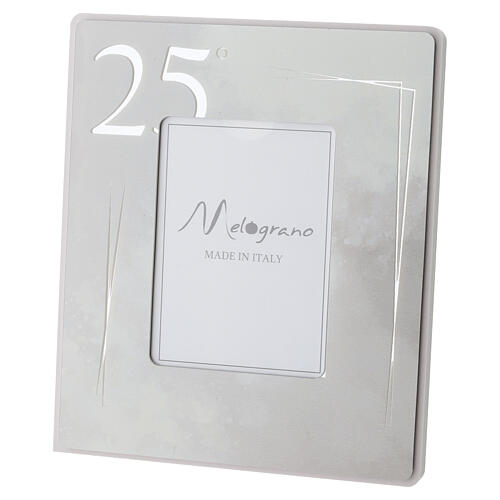 Stojąca ramka na zdjęcie dedykowana Srebrnym Godom, ozdobiona dekoracyjnymi motywami i błyszczącą cyfrą „25”.