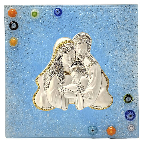 Ikona przedstawia Świętą Rodzinę w bilaminacie z cienką warstwą srebra na szkle, zdobiona tradycyjnymi murrinami z Murano.
