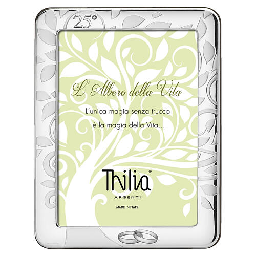Brzeg zdobi ton‑w‑ton relief z liści oraz wygrawerowany symbol „25” u góry; na dolnej części znajduje się dekoracja z nałożonych, srebrnych obrączek na połyskującym tle, motywy szczególnie odpowiednie jako prezent na srebrne gody lub pamiątka rocznicy ślubu.