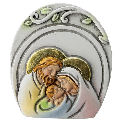 Magnes w kształcie łuku z kolorowym wizerunkiem Świętej Rodziny.