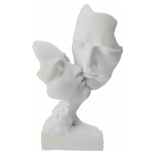 Nowoczesna rzeźba przedstawiająca dwie splecione twarze w pocałunku, utrzymana we współczesnym stylu.